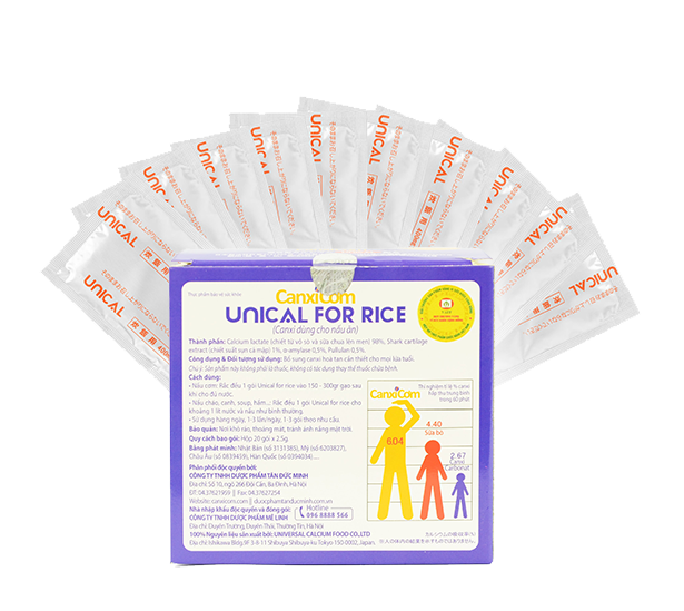 Unical – Canxi cơm phù hợp với mọi độ tuổi, mọi đối tượng trong gia đình. Chỉ cần 1,2 gói Unical cho vào cơm trong mỗi bữa ăn, cả gia đình sẽ đủ canxi cho nhu cầu cả ngày.